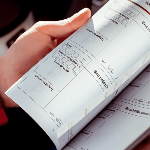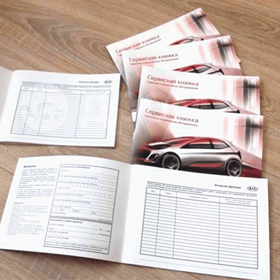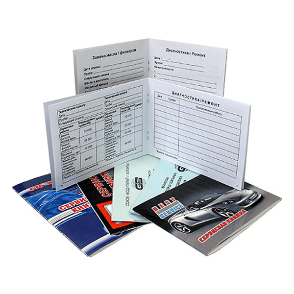 Сервисные книжки, как правило, имеют формат А6 или А5 , они многостраничные, примерно 40 страниц. Печать обычно черно-белая, а страницы могут быть расположены как в книжной, так и в альбомной ориентации.
