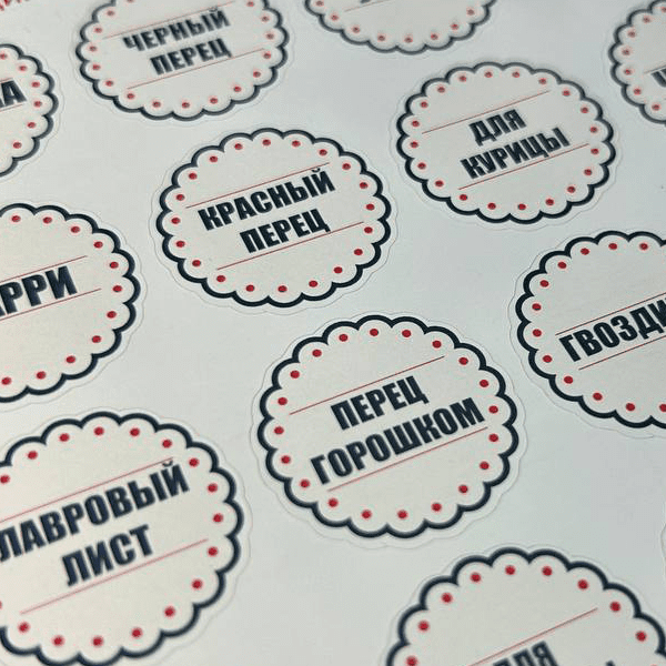 Печать возможна как в один цвет, так и полноцветная (CMYK). Также доступны варианты с тиснением, вырубкой по контуру, защитной ламинацией и УФ-лаком. Мы используем качественные материалы, которые не тускнеют со временем и не размазываются при наклеивании.