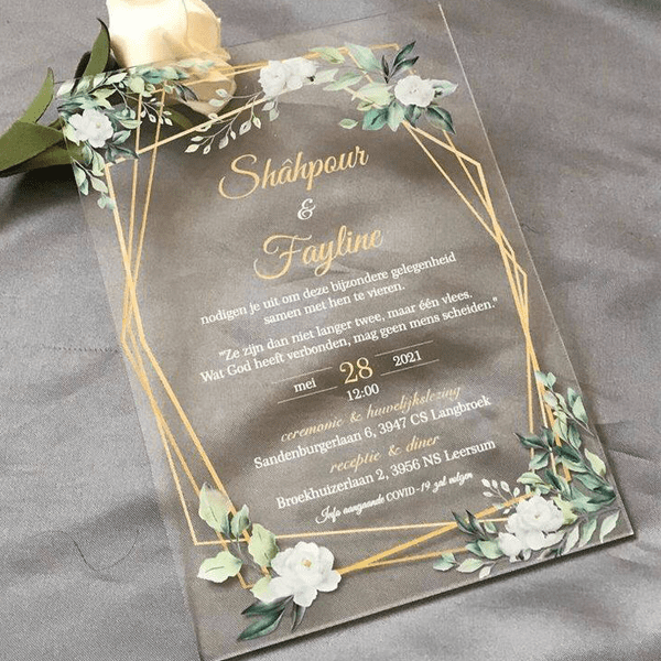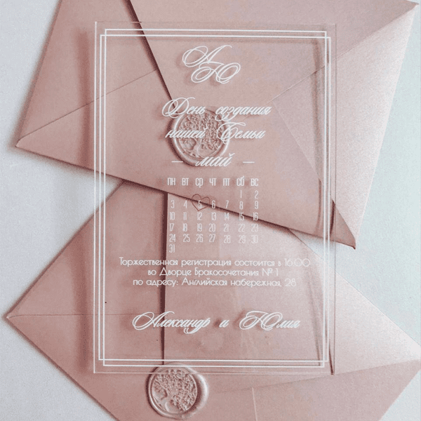 Чаще всего при изготовлении пластиковых пригласительных используется белый или прозрачный акрил толщиной от двух до восьми миллиметров. Популярный дизайн — яркий цветной или черно-белый рисунок на прозрачном фоне.